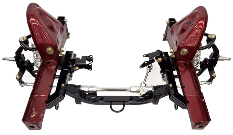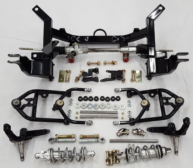 Easy to install and work with, the Alterktion system bolts up to factory frame rails, and as such, is accepted in many classes where other suspension kits are not. Brake kits are widely available for Mustang II spindles, so if you don't want to use the Wilwood kits we carry, you can easily choose your own brake kit from any aftermarket manufacturer. System comes complete from connection to your steering column, down to the spindles. Engine mount options include complete mounts to block, all are poly bushed spool-type mounts. Simply add a brake kit to build a complete suspension system.