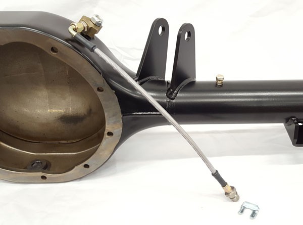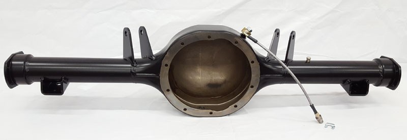 To simplify your project, we build up a brand new Moser 9" thick wall round-back housing, add a drain plug, a new axle vent, a braided stainless brake hose kit with new brass Mopar-style Tee, we weld on all the correct suspension mounting brackets, and powdercoat the housing satin black to match the suspension. Then we include a matching set of heavy duty Moser 31-spline axles with 2.5” offset, big ford tapered bearings(78 ford truck), screw-in studs, and an access hole in the flange to access retainer nuts.