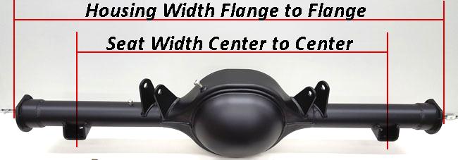 This item is stock-width 68-70 B-body, 54-7/8" flange to flange housing, 2.36" offset axles, 60-1/8" wheel-to-wheel measurement using Wilwood or Baer disc brakes.