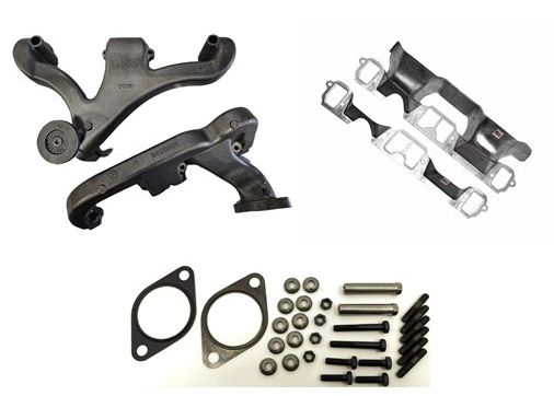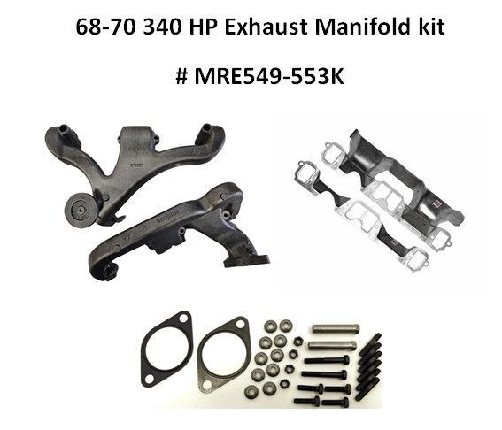 Left and Right Exhaust manifolds, Left Manifold shield/gasket, Right Manifold gasket. 2 1/2" Exhaust Manifold Flange Gasket and 68-70 340 manifold mounting hardware.