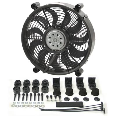Derale Performance high output single RAD fans feature: a versatile, state-of-the-art symmetrical design; high-output, 265-watt, 2-speed motors; and ultra-quiet, patented skewed blades for maximum airflow. High output single RAD fans can be mounted as a pusher or puller, with no need for blade flipping or motor lead switching. Derale offers these fans in a variety of sizes in standard (push-through plastic rod mount) and premium (patented ratchet mount) styles.