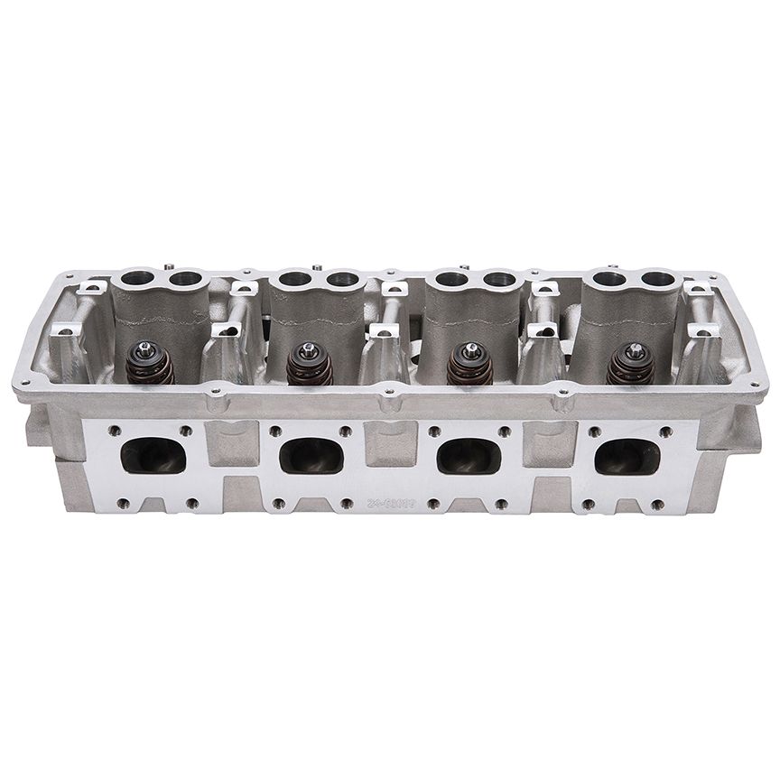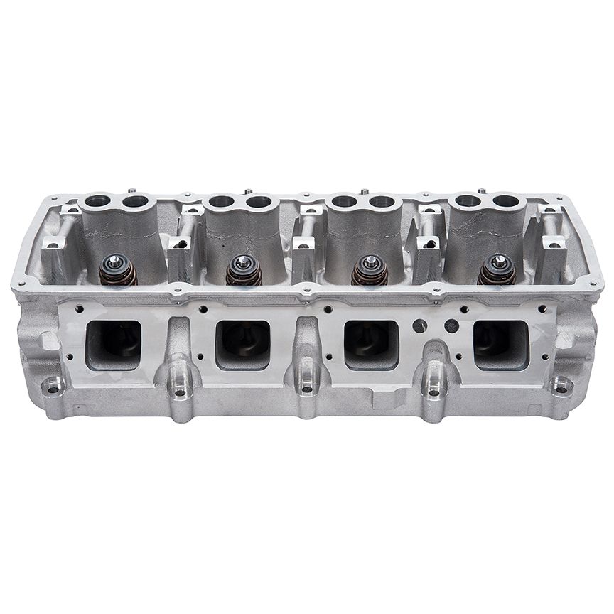 These Edelbrock Performer RPM Chrysler Gen III HEMI cylinder heads are bolt-on performance upgrades for Gen III HEMI engines. They are designed to fit with the stock intake manifold, exhaust manifold, valve cover, rockers, spark plugs, and accessories, as well as Hellcat components. The cylinder heads have been machined to be used on either the driver or passenger side of the block. They are cast from A356 aluminum and are heat-treated to T6 specifications. Edelbrock Performer RPM Chrysler Gen III HEMI cylinder heads feature fully CNC-machined combustion chambers, along with CNC-profiled bowls and port entries/exits for improved airflow. They also feature more material in the deck and reinforced combustion chambers for increased cylinder pressures. The rocker bosses have been reinforced for improved stability and strength, and extra material has been added around the intake and exhaust ports to allow for porting in racing applications. Both the intake and exhaust port flanges have remained in the factory location for use with OEM components. The intake and exhaust valves have been tipped away from the bore wall to unshroud the larger valves, while maintaining factory geometry. The seat diameters have also been increased for improved heat transfer and durability over stock.