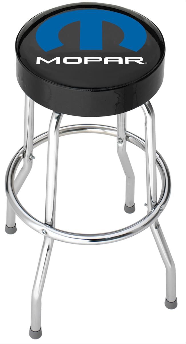 This Mopar bar stool captures the 1950s era design with heavy chrome plated legs and a single ring footrest. A large 4 in. thick, 14 in. durable vinyl cushion is topped with an Omega-style Mopar logo. The non-swivel stool measures 30 in. tall.