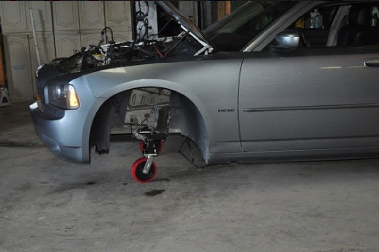 Dodge LX Body wheel set. This is a set of two Front body wheel brackets and 8" solid caster wheels. Perfect to roll your Charger R/T body around in your shop or take it onto your trailer to go to the paint shop etc. Each set includes two front 8" ball bearing swivel caster body wheels. The front brackets are specially designed, formed and welded to allow bolting onto the K-frame bolting locations. Each set fits ALL Mopar Dodge LX body cars. Brackets are powdercoated in wrinkle black for years of great looks, even in the roughest garage environment. We use them in our shop all the time!